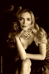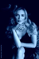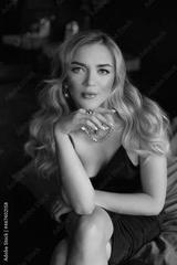 A fashionable young woman with perfect blond hair and perfect trendy makeup in an elegant black dress in dark interior. Beautiful blonde model girl with full lips and deep seductive eyes