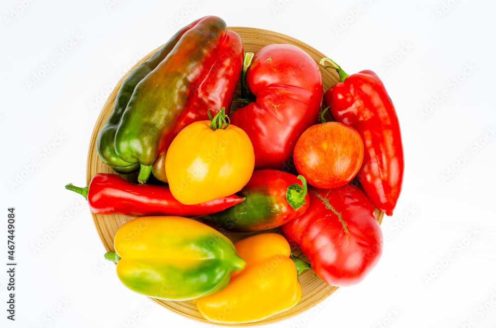 Arrangement of colorful fresh assorted bell peppers and tomatoes in wooden plate on white background. Studio Photo.