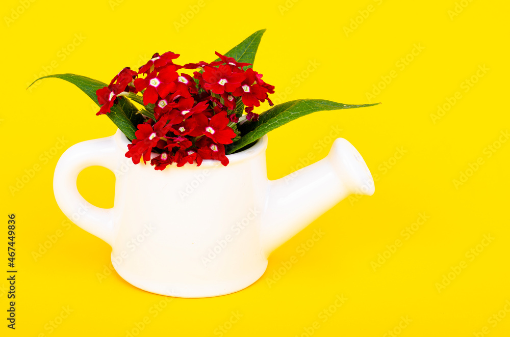 White vase in form of watering can with flowers on bright background. Gardening concept. Studio Photo