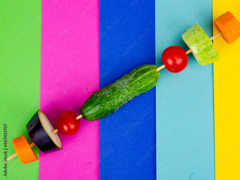 Organic fresh slises vegetables on wooden stick. Vegan or healthy food concept. Minimalistic still life on color bright background.