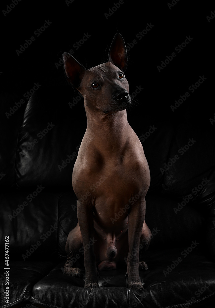 Xoloitzcuintle (Mexican Hairless Dog) sitting on leather sofa against black background with slightly tilted head