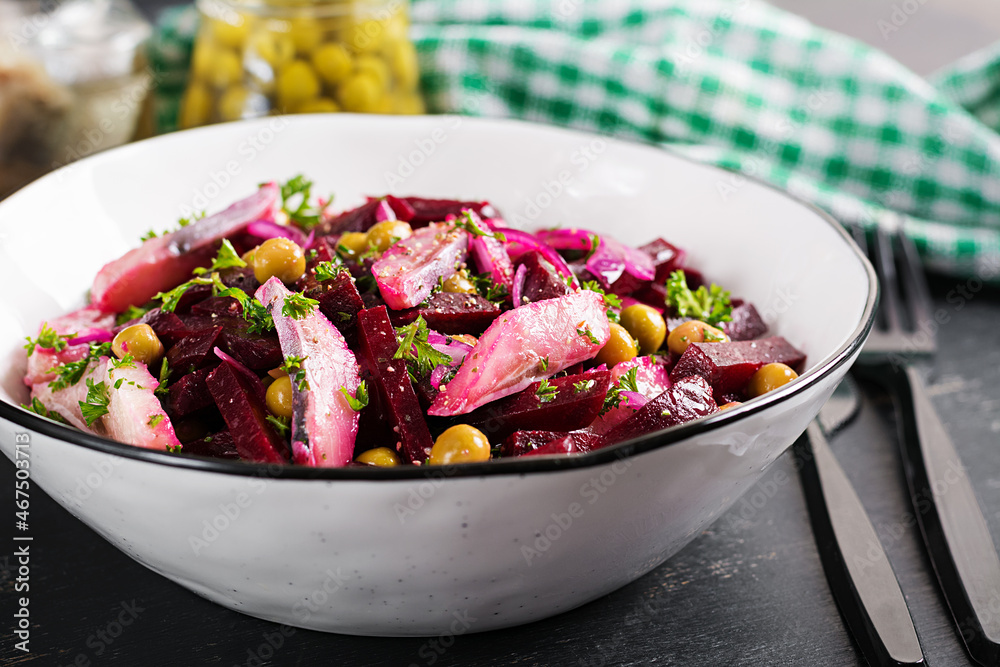 Salad with herring, green peas and beetroot filled with vegetable oil on a dark table.