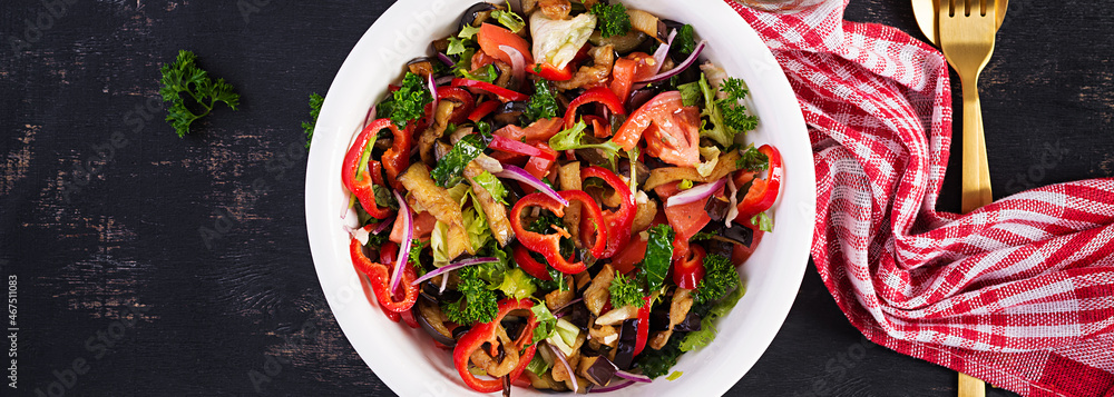 Salad baked eggplant and fresh tomatoes. Warm eggplant salad. Top view, banner