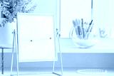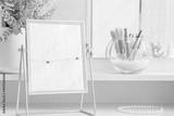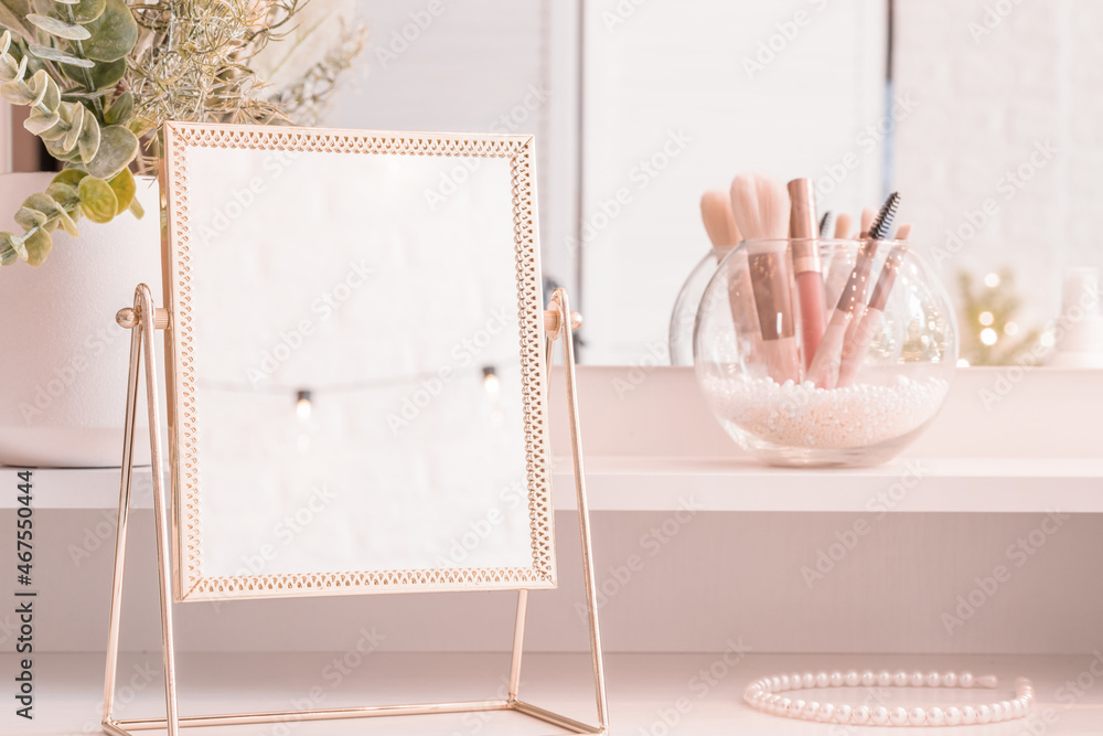 Table mirror on dressing table with make up accessories. Self-Care. White, pastel interior