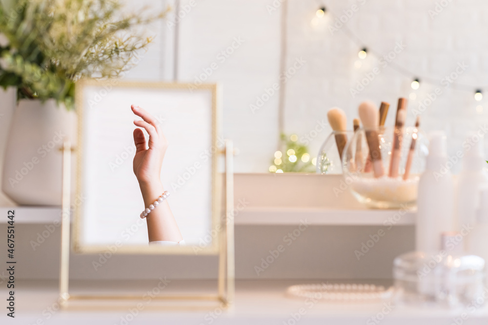 Сhristmas, light bulbs, eucalyptus, fir, pine branches in a vase on dressing table with make up accessories. Reflection in table mirror of woman hand in pearl bracelets