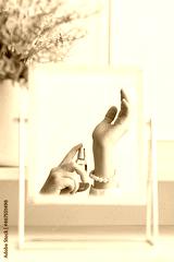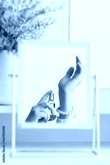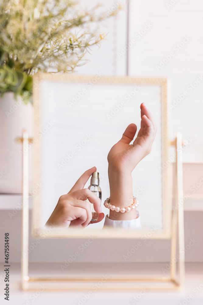 Reflection in table mirror of woman applying perfume on her hand near dressing table with make up accessories. Self-Care. White interior. Vertical