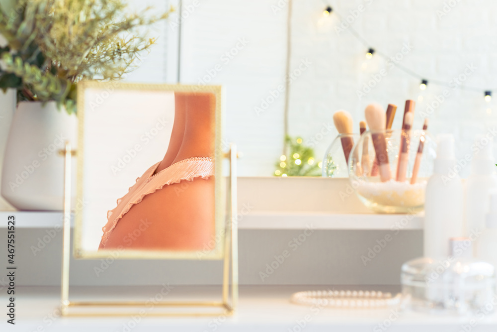 Reflection in table mirror of woman in underwear on dressing table with make up accessories. Self-Care. White interior