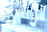 Table mirror on dressing table with make up accessories. Self-Care. White, pastel interior