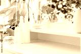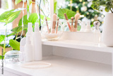 Woman daily cream on dressing table with make up accessories. Reflection of christmas tree, light bulbs in table mirror.