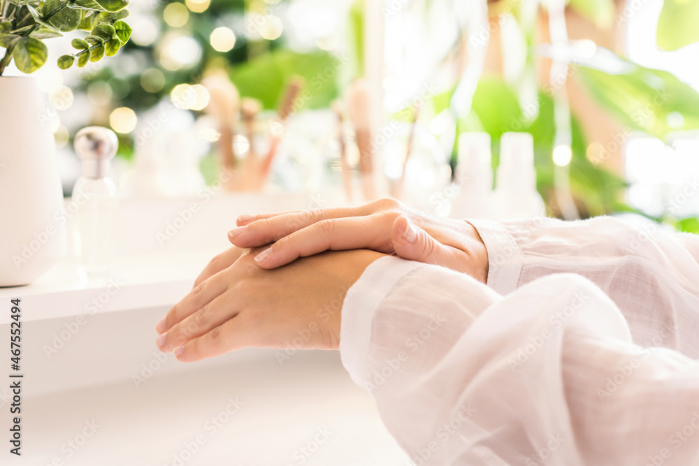 Woman applying daily cream on her hand sitting near dressing table with make up accessories. Reflection of christmas tree, light bulbs in table mirror.