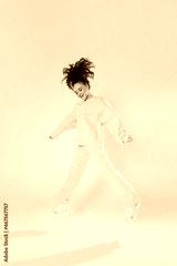 Inspired positive young woman in sneakers and fashion sportswear jumps on white background. Gorgeous young female model with dark wavy hair jumping in the studio. Not isolated with copy space