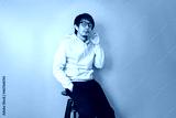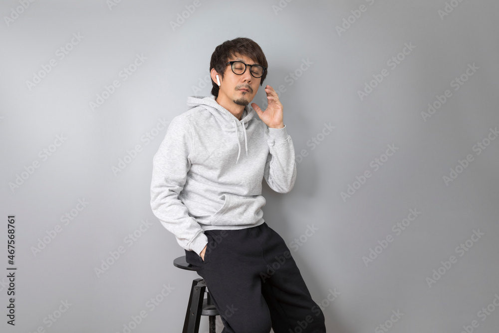 Asian man listen to the music via earpod sitting on chair on grey background.