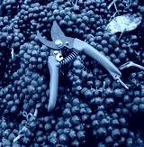 Hampshire, England, UK. 2021. Harvest time in a vineyard, freshly picked Pinot Noit grapes and a pair of secateurs used in the process. Pink rubber gloves for the pickers safety.