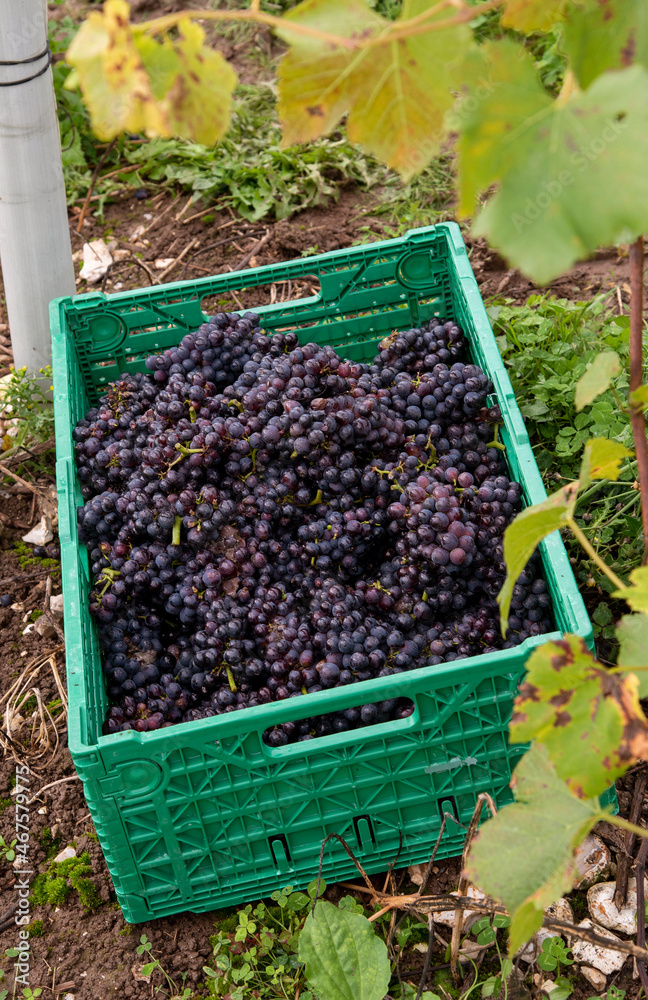 Hampshire, England, UK. 2021. Freshly picked bunches of Pinot Noir grapes wait to be transported to the winery in a Hampshire vineyard. UK.