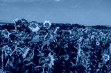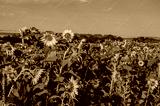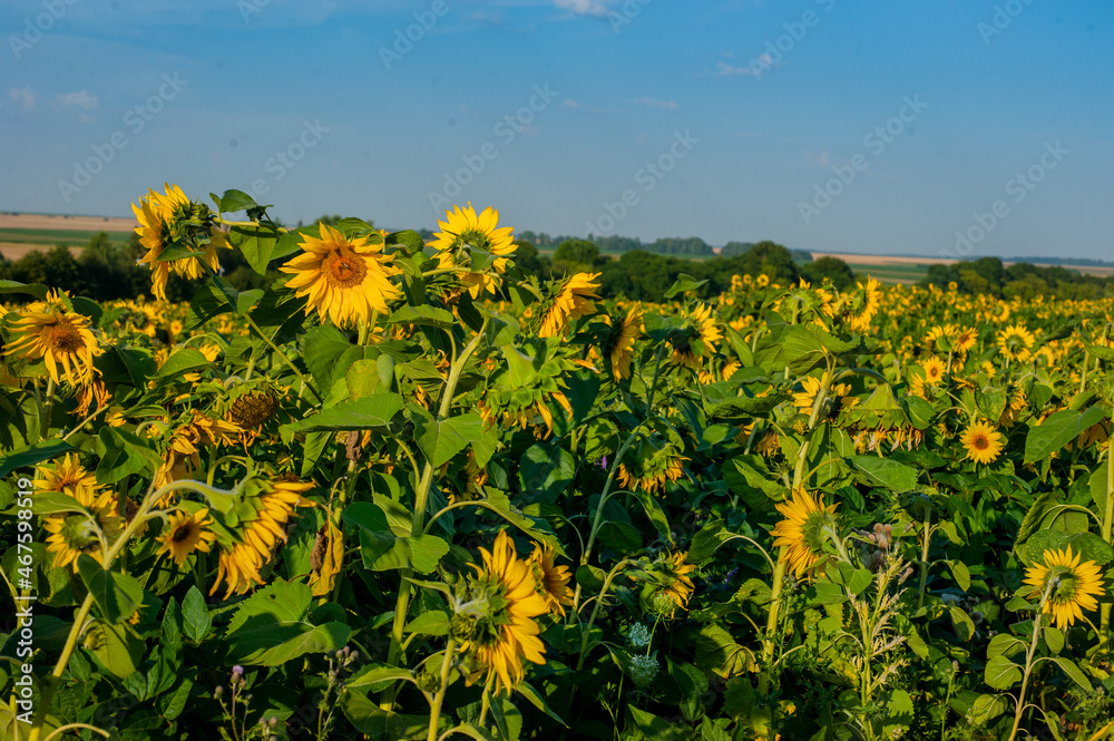 Mini sunflower at field. Field of flowering sunflower plants in the morning sun contours.