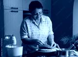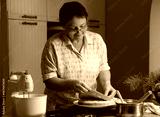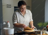 An elderly woman in the kitchen makes a cake. Healthy homemade food.