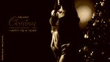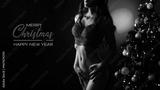 girl in red underwear with a sexy figure next to Christmas tree. Holiday Greeting Card