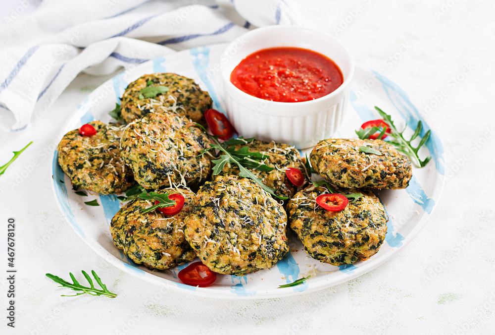 Delicious chicken meat patties with garlic tomato sauce. Diet food.