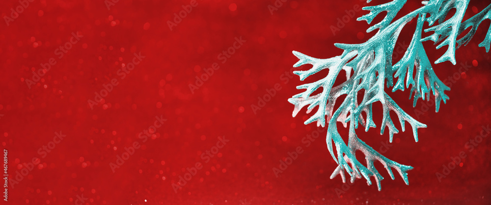 Sparkly silver Christmas stag horn plant on red glitter background . Christmas or New Year minimal concept banner. Copy space banner
