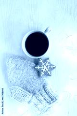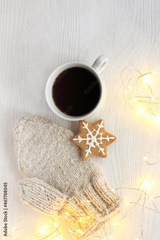 black coffee in a cup, ginger snowflake and knitted mitten with lights included garland top view. festive winter drink