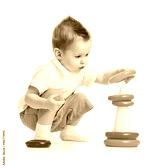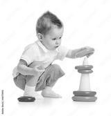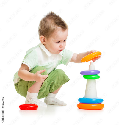 Cute child playing colorful tower isolated on white