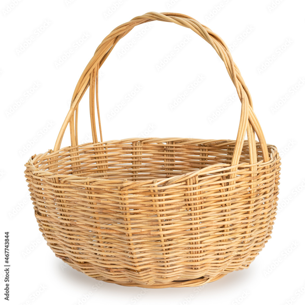 Empty wooden wicker basket isolated on white background.