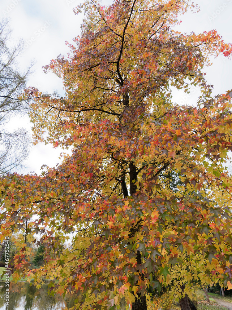 Copalme d'Amérique ou Liquidambar styraciflua. Arbre d'ornement à cime ovale, bois précieux à écorce brun foncé, feuillage palmé, lobé et étoilé de vert, rougeâtre à pourpre en automne