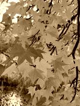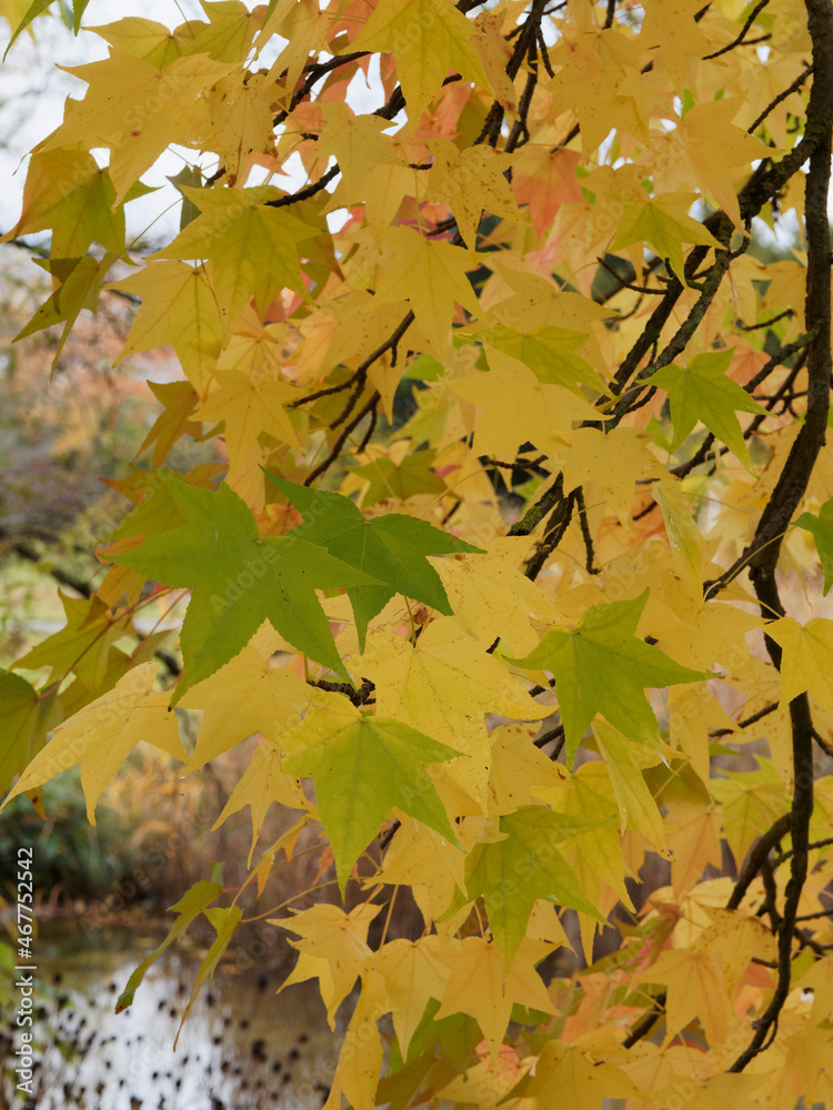 (Liquidambar styraciflua) Gros plan sur feuilles étoilées, palmatilobées et finement dentées de couleur vert, jaune à rouge pourpré de Copalme d'Amérique ou Liquidambar