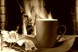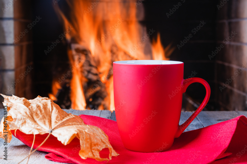 Mug for tea or coffee and autumn leaves before cozy fireplace.