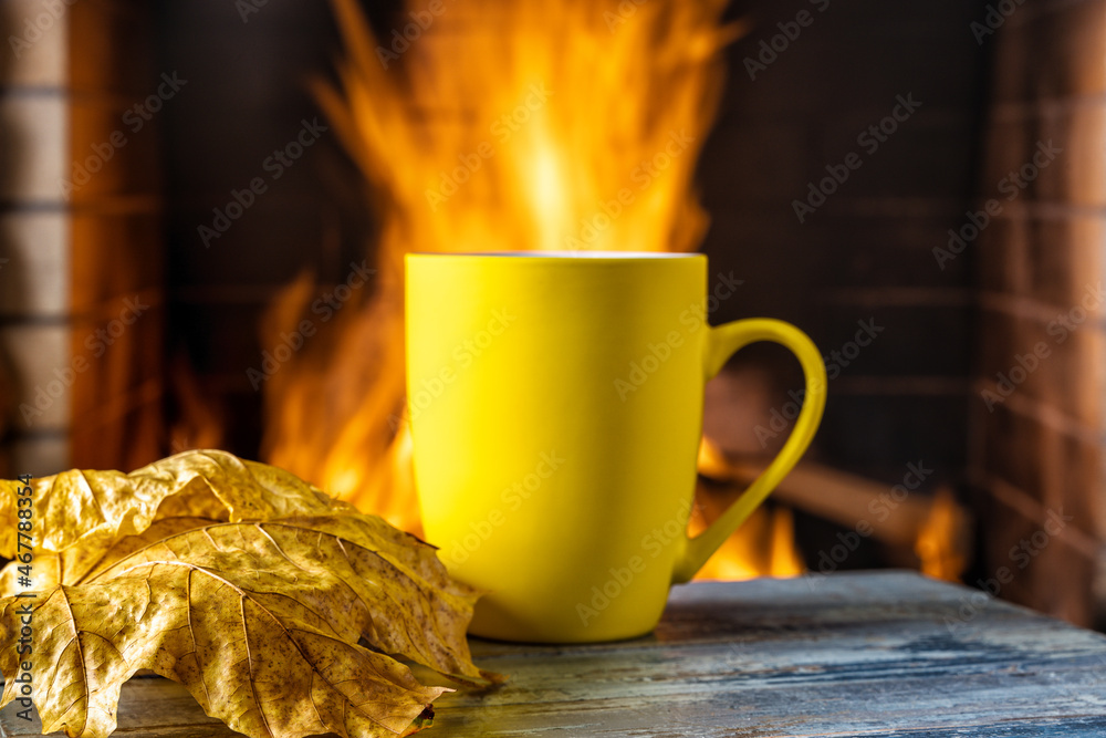 Mug for tea or coffee and autumn leaves before cozy fireplace.