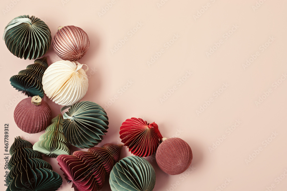Scandinavian christmas paper honeycomb ornaments. Modern christmas decoration, minimalist and plastic free. Flat lay, top view