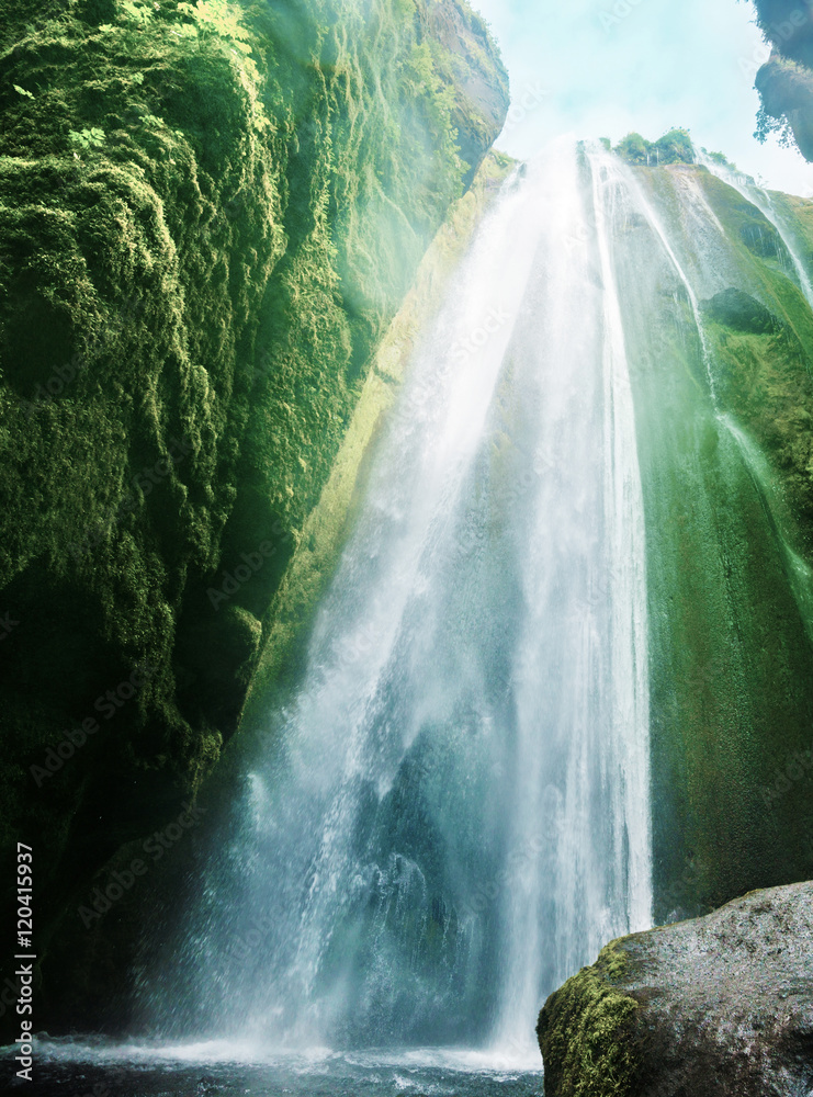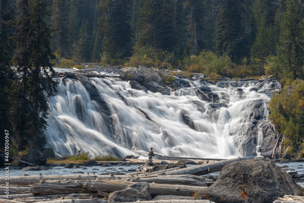 Fly fisherman fishing in a river at the base of a large waterfall in the mountains.