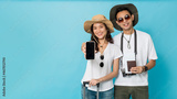 Asian happy young couple tourist preparing for travel holding smartphone and luggage with copy space isolated on blue banner background.