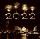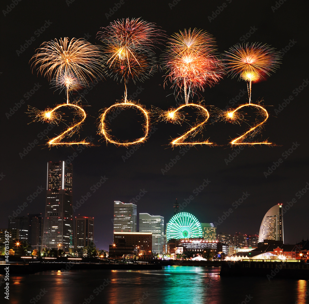 2022 Happy new year firework Sparkle over Yokohama cityscape at night, Japan