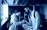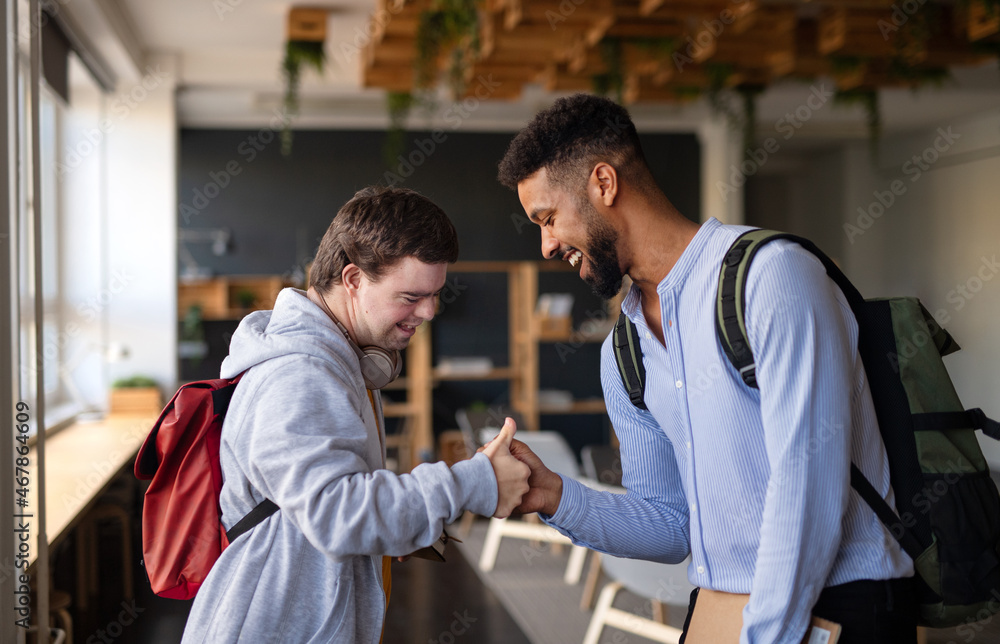 Young happy man with Down syndrome with his mentoring friend greeting indoors at school.