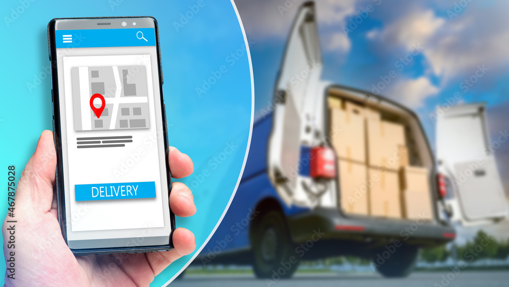 Delivery apps in hand of man. Application interface with Delivery button. Calling courier via mobile website. Blurred delivery van with boxes. Courier tracking application in smartphone