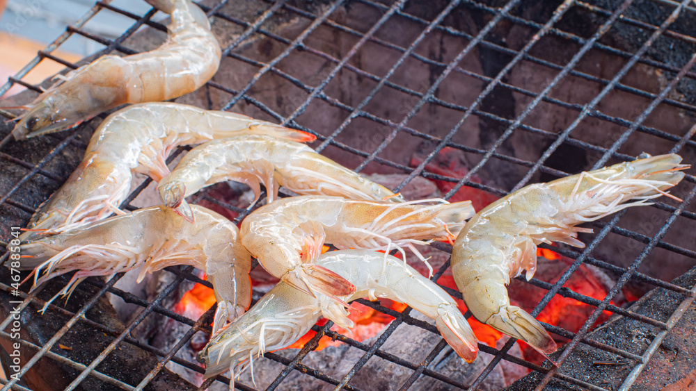 Fresh shrimp on a grill, under fire from charcoal. Grilled Seafood Grilled shrimp on a charcoal stove