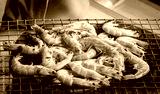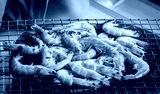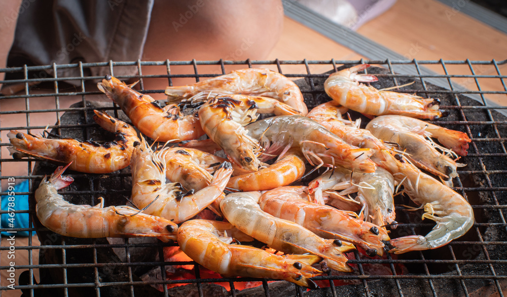 Fresh shrimp on a grill, under fire from charcoal. Grilled Seafood Grilled shrimp on a charcoal stove