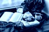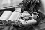 winter holidays and leisure concept - open book, fir branch, oatmeal cookies, cup of coffee and christmas decorations on window sill at home