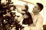 winter holidays and family concept - happy middle-aged father and baby daughter decorating christmas tree with ball at home
