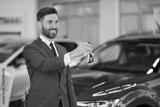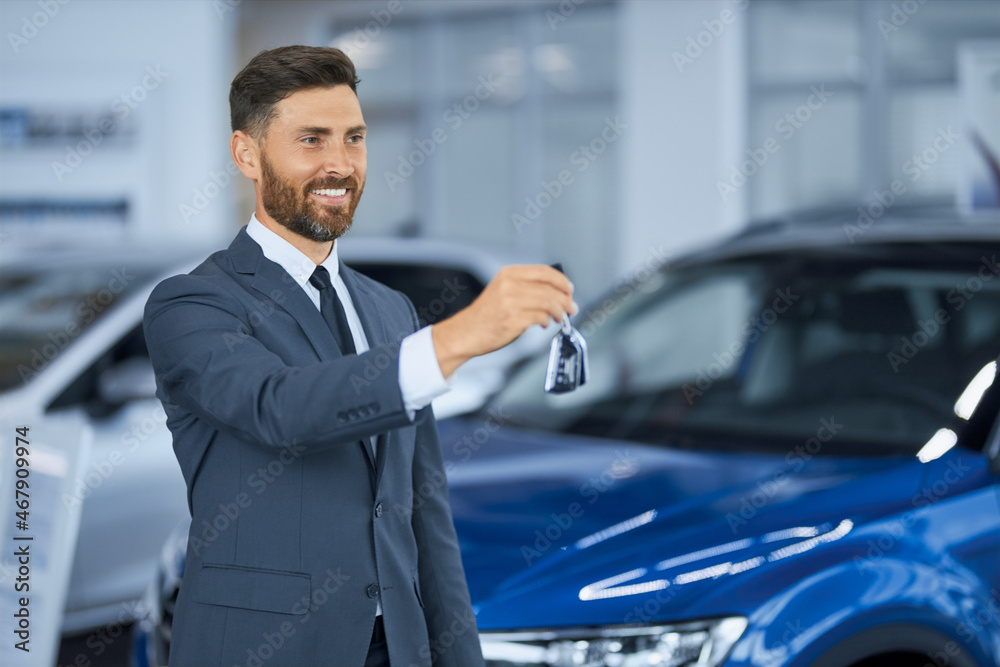 Happy bearded man in stylish suit posing at modern car center with keys in hands. Successful businessman buying new transport at showroom.