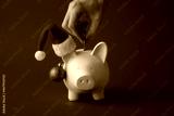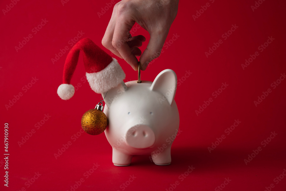 Festive financial savings concept. Piggy bank with Christmas decorations