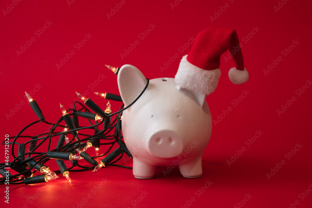 White piggy bank money box covered in festive fairy lights, Christmas saving background