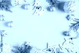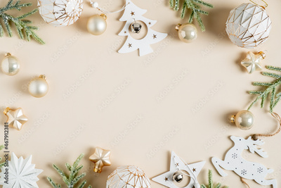 Christmas composition. Frame made of vintage Christmas decorations and fir branches on beige background. Flat lay, top view, copy space.