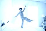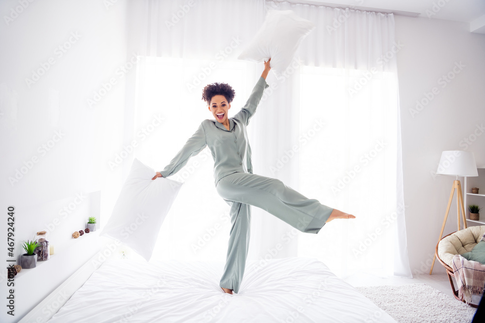 Full length body size view of attractive cheerful girl dancing on bed having fun at light white home indoors