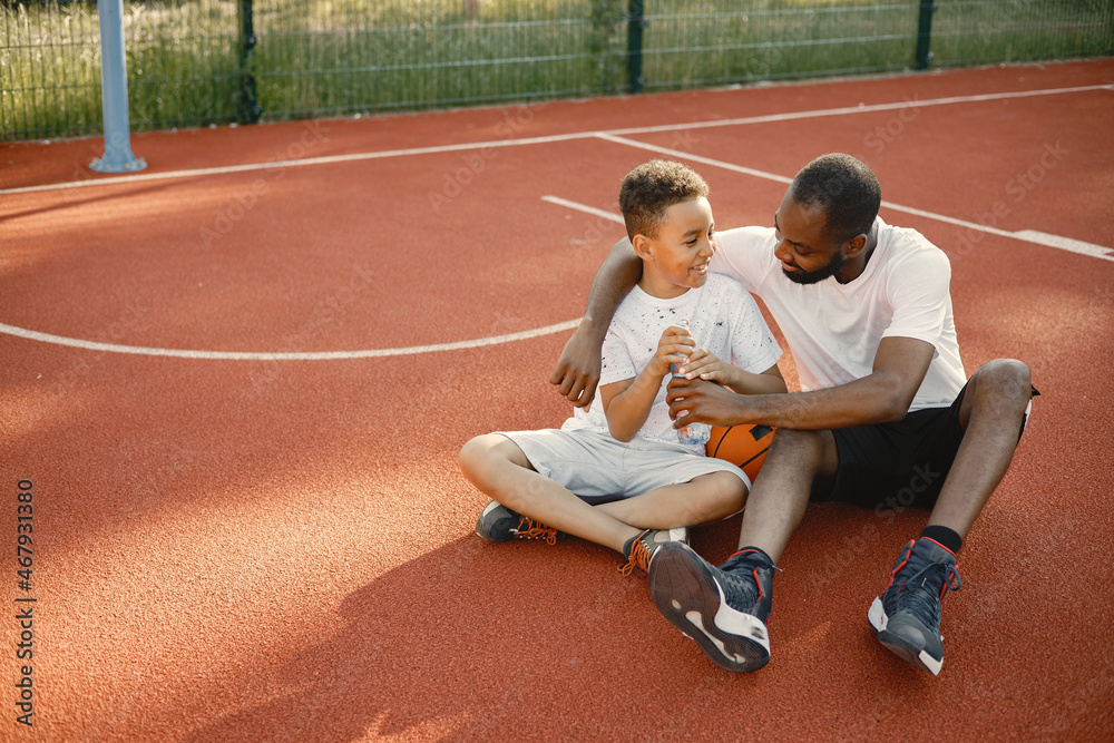 Black father with his multiracial son sitting on a basketball court together