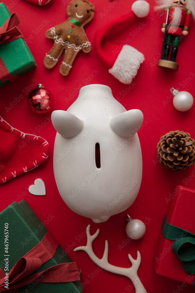 Festive Christmas financial savings concept. White piggy bank money box with presents and decorations
