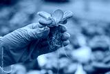 Crop farmer with green plant in soil in greenhouse