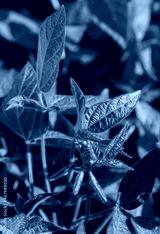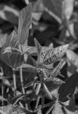 Young soybean plants with flowers on soybean cultivated field. Agricultural soy plantation background. Green growing flowering soybeans