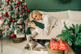 Frustrated depressive sad sick woman in pajamas lies on the sofa in christmas alone. Holidays alone at home.